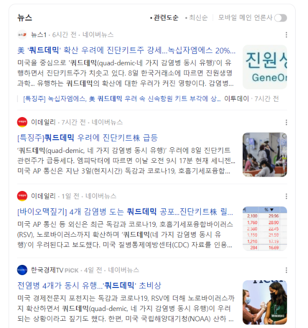 코로나19, 독감, RS바이러스, 마이코플라스마가 동시에 유행하는 쿼드데믹(Quaddemic) 상황이 지속되면서, 관련 기업들의 실적 개선과 주가 상승 기대감이 높아지고 있습니다. 오늘은 진단, 치료, 예방 분야에서 각각 두각을 나타내고 있는 에스디바이오센서, 대원제약, 진원생명과학의 사업 현황과 쿼드데믹 관련주에 대해 알아보겠습니다.