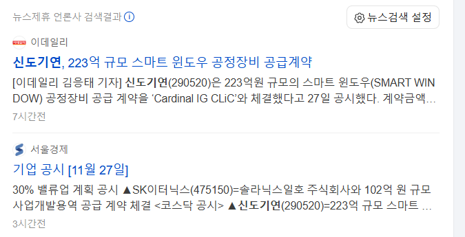 • 신도기연(290520)은 223억원 규모의 스마트 윈도우(SMART WINDOW) 공정장비 공급 계약을 ‘Cardinal IG CLiC’와 체결했다고 27일 공시했다. 계약금액은 최근 매출액 대비 107.6%다. 계약기간은 이달 26일부터 2025년 12월1일까지다.