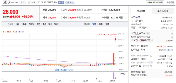 SBS(034120)가 넷플릭스와의 콘텐츠 공급 계약 소식으로 2거래일 연속 상한가를 기록하고 있습니다. 23일 현재, 전 거래일 대비 30%(6,000원) 상승한 2만 6,000원입니다. 이는 지난주 금요일에 이어 연속 가격제한폭까지 상승했습니다.