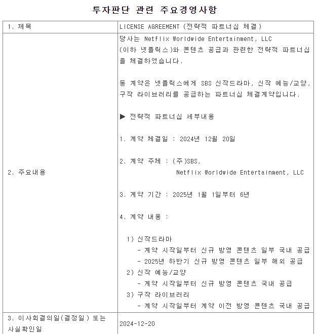 SBS는 지난 20일, 넷플릭스와 콘텐츠 공급 관련 전략적 파트너십을 체결했다고 발표했습니다. 이번 계약의 주요 내용입니다.